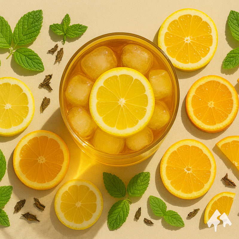 Garnish: Fruct deshidratat, felie de lămâie, frunze de mentă